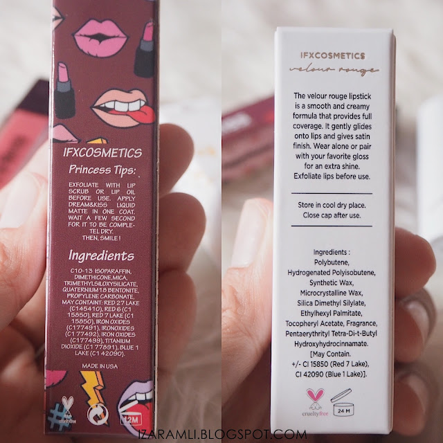 Hello readers! Hari ni Iza nak share dengan korang lipstik yang Iza dapat dari IFX Cosmetics. Iza dapat 2 jenis lipsticks which is Dream & Kiss dengan kod warna Candy Floss dan Velour Rouge dengan kod warna Dreamland.